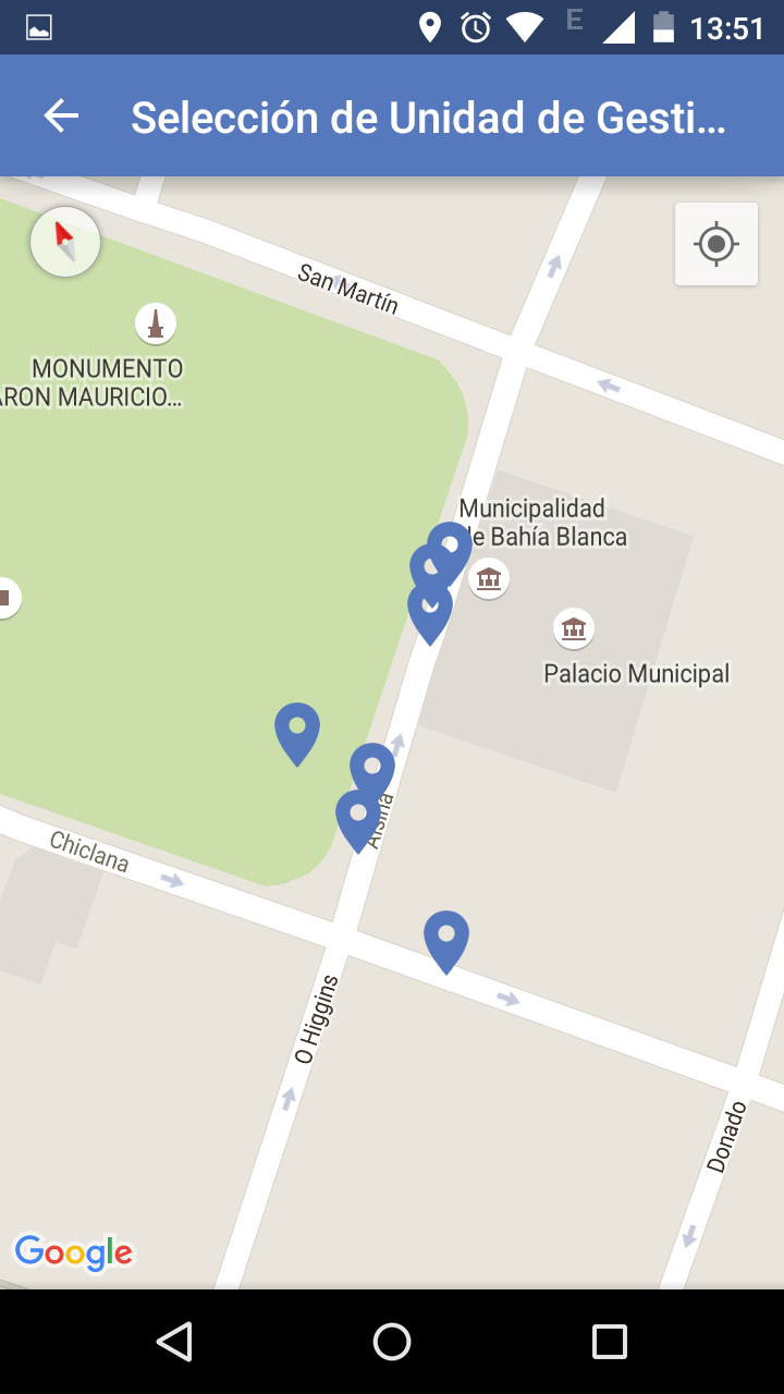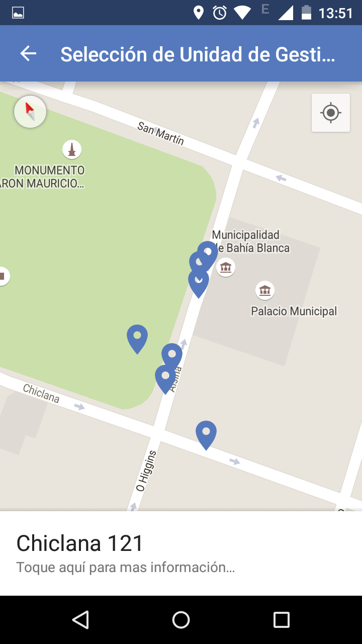 2. Utilizar la calle y altura, tocando el icono del plano, esto carga el plano, y le muestra un punto negro (dato georrefenciado), y le muestra adicionalmente al centro elegido, otras unidades de gestión en un radio de 200 metros. Puede tocar el punto negro (dato introducido), puede mover el punto a otro lugar (para ello, mantenga apretado con el dedo y suelte en el destino), o bien elegir otra unidades de gestión distinta a la que Usted indicó anteriormente. Luego puede continuar tocando y viendo si tiene historial (antecedentes).