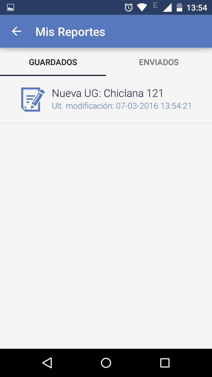 Luego de subir la información al servidor, podrá verla en la sección del Menú principal “Ver guardados/Enviados”, también como lo indica el título del menú, puede ser nuevos reportes o nuevas UG guardas para mandar (para ello toque la indicada y luego envíe al servidor).